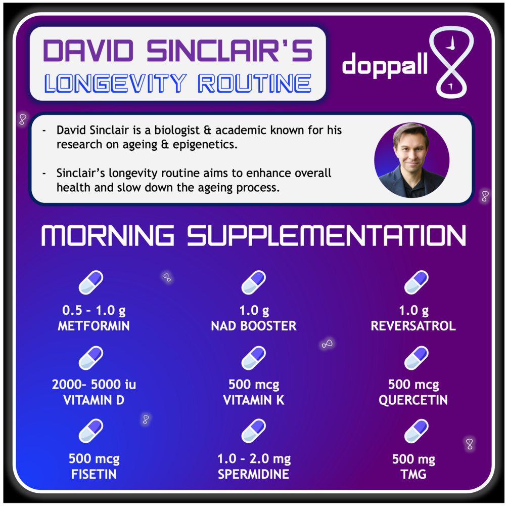 Make yourself younger with Dr David Sinclair's longevity routine. Every block details his daily age-defying practices and supplementation that you can adopt today. I have linked every supplement he recommends for your convenience - buying them from these links supports me.